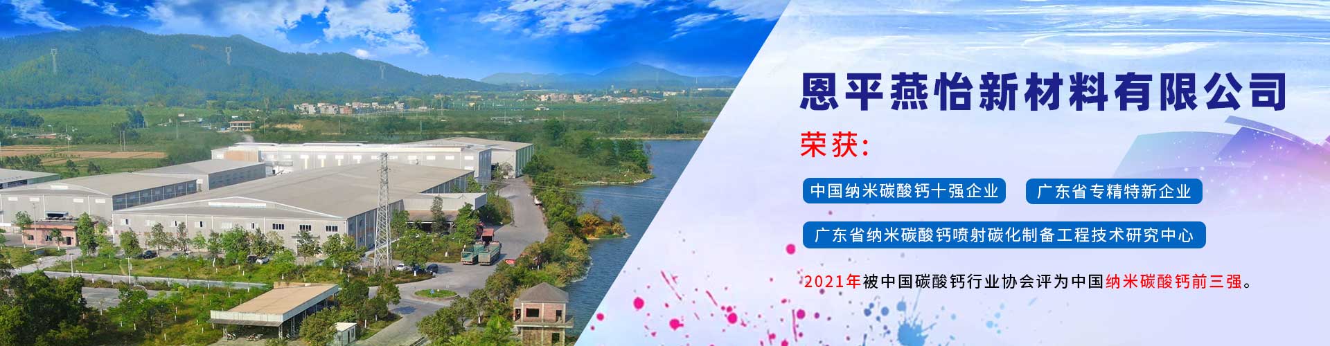 恩平燕怡新材料有限公司成立于2006年,位于廣東省江門恩平市。是一家專注于納米碳酸鈣產(chǎn)品研發(fā)、生產(chǎn)以及銷售服務的新材料企業(yè)。 公司榮獲 “高新技術企業(yè)”、 “清潔生產(chǎn)企業(yè)”、“廣東省納米碳酸鈣噴射碳化制備工程技術研究中心” 、 “中國納米碳酸鈣十強企業(yè)” 、 “廣東省專精特新企業(yè)”等稱號,并通過ISO9001:2015質量管理體系認證,產(chǎn)品質量符合國家行業(yè)標準GB/T19590—2011納米碳酸鈣優(yōu)等品的要求。...